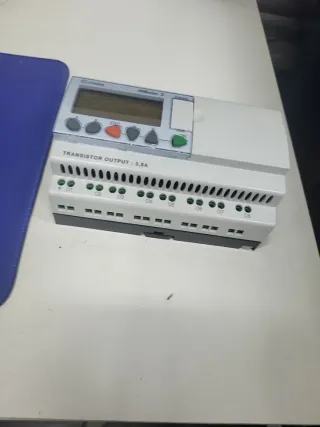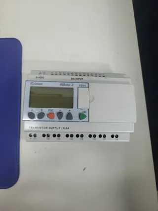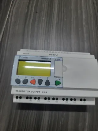 Controlador lógico programable (PLC) Crouzet Millenium 3 CD20. Es un módulo de control compacto diseñado para la automatización de máquinas e instalaciones pequeñas. El modelo Millenium 3 es la última generación de la serie Millenium, con una memoria mejorada en comparación con su predecesor. Este controlador lógico tiene 12 entradas digitales y 8 salidas de relé con una corriente nominal de contacto de 8A. El dispositivo funciona con una tensión nominal de 24 V CC y tiene una pantalla LCD retroiluminada verde. Se puede programar utilizando diagramas de relés o bloques de funciones. 🥇COMO NUEVOS🥇