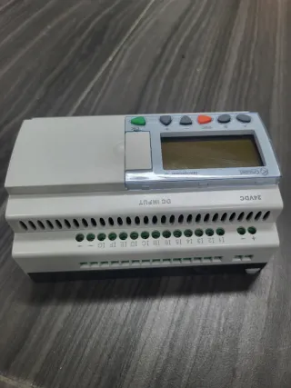 Controlador lógico programable (PLC) Crouzet Millenium 3 CD20. Es un módulo de control compacto diseñado para la automatización de máquinas e instalaciones pequeñas. El modelo Millenium 3 es la última generación de la serie Millenium, con una memoria mejorada en comparación con su predecesor. Este controlador lógico tiene 12 entradas digitales y 8 salidas de relé con una corriente nominal de contacto de 8A. El dispositivo funciona con una tensión nominal de 24 V CC y tiene una pantalla LCD retroiluminada verde. Se puede programar utilizando diagramas de relés o bloques de funciones.