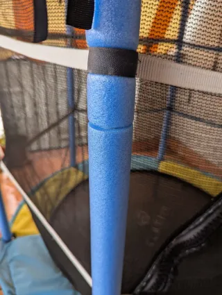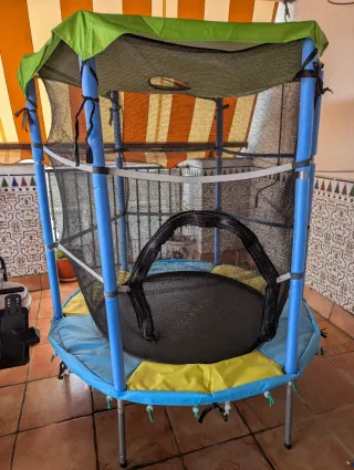 Cama elástica infantil de 106cm de diámetro, ideal para que los más pequeños disfruten saltando. Es de gomas en lugar de muelles y hace poco le cambié algunas. Ideal para 3-4 años, mi hijo tiene 6 y al ser de gomas ya no tiene fuerza para el. Después de arreglarselo todo no la usa por eso, ya necesita una de muelles. La cubiera de ls gomas es nueva. - Incluye red de seguridad. - Estructura con protectores de espuma recién cambiados. - Cubierta protectora verde nueva. - Cremallera también cambiada por una de plástico mas gruesa y segura.