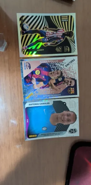 Colección de cartas de la Liga F de Panini. - Carta de Luany. - Carta de Alexia Putellas y Aitana Bonmatí. - Carta de Antonia Canales. - Cartas variadas Liga F