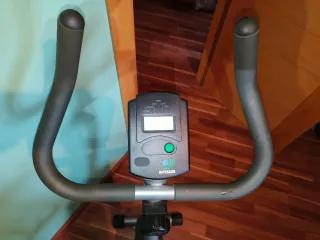 Bicicleta estática de la marca Hipercor. - Sillín acolchado y ajustable en perfecto estado. - Manillar algo dañado (ver fotos). - Pantalla digital con información de entrenamiento. La pantalla funciona a pilas, pero están sulfatadas como aparece en las fotos. Hay que sustituir el soporte de las pilas.