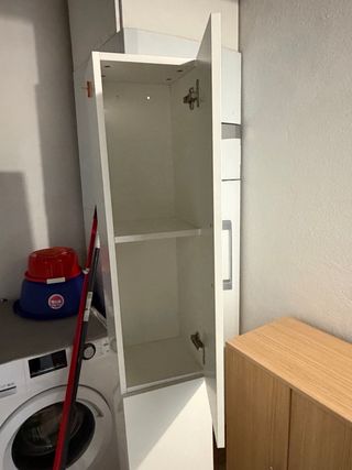 Armario alto y estrecho, ideal para espacios reducidos como baños o lavaderos. Su diseño moderno y minimalista se adapta a cualquier decoración. Alto: 1,81 cm Ancho: 26,5 cm Fondo: 24,5 cm - Dos puertas con tiradores metálicos. - Base con patas metálicas. No realizo envio, recoger en domicilio. Cabe en un coche con los asientos abatidos.