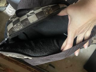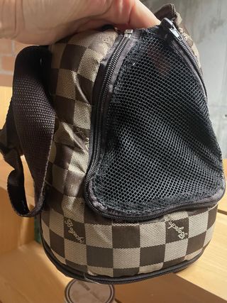 Bolso de transporte para mascotas con un diseño a cuadros. - Asa de hombro ajustable. - Malla transpirable en la parte superior. - Cierre de cremallera.