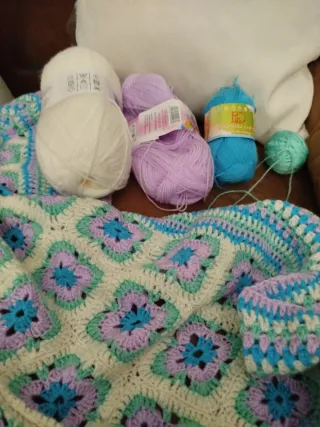 Manta artesanal tejida a mano con un diseño floral. - Colores: blanco, lila, azul y verde. - Material: lana.