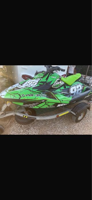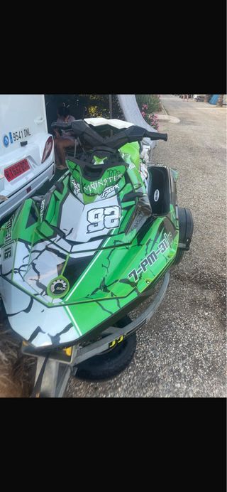 Moto de agua Sea-Doo con un llamativo diseño verde y detalles en negro. Presenta el número 92 en varios puntos de la carrocería. Moto muy mimada todo en perfecto estado, es 90 cv subida a 130 cv en centralita aro de sacrificio con aro de acero nuevo batería nueva cable de dirección se lo puse ace un año y la instalación de toda la moto nueva q se la puse el año pasado con su altavoz seado y su soporte tiene 165 h -Doy dos chalecos -2 llaves -y su funda de seado - Incluye remolque