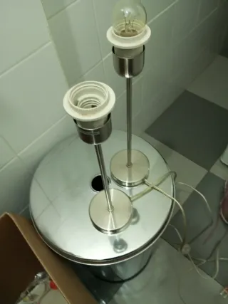 Conjunto de dos lámparas de mesa con un diseño moderno y elegante. - Base y pie de metal plateado. - Portalámparas de plástico blanco. - Bombilla de cristal transparente incluida.