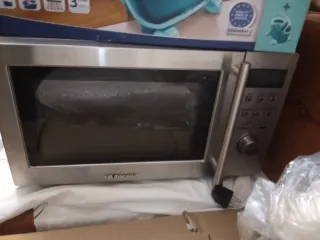 Microondas de acero inoxidable con acabado plateado. - Diseño moderno y elegante. - Panel de control digital.