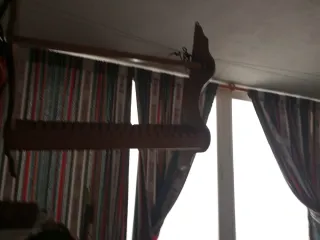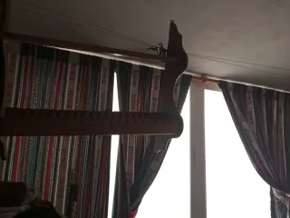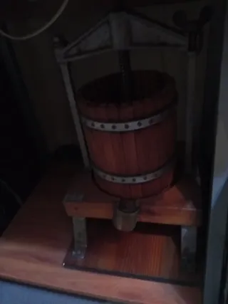 Prensa antigua de madera, ideal para coleccionistas o como elemento decorativo. - Estructura de madera. - Aros metálicos de sujeción. - Mecanismo de tornillo.