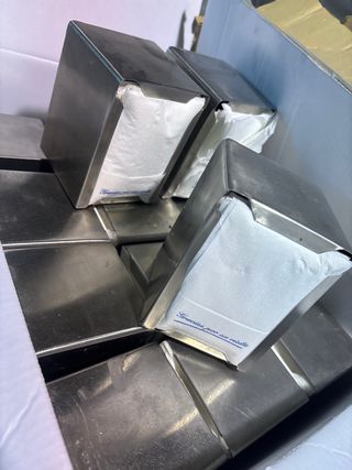 Conjunto de servilleteros de diseño moderno. - Fabricados en metal plateado. - Incluyen servilletas de papel blancas. -27 servilleteros