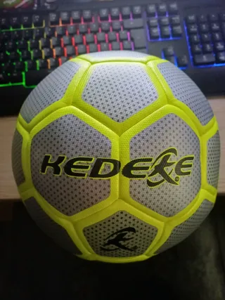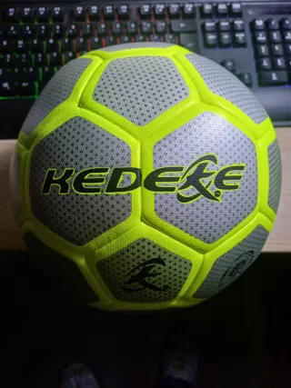 Balón de fútbol KEDEXE con un diseño moderno y llamativo. - Color gris con detalles en amarillo neón. - Superficie texturizada para mejor agarre. - Logotipo de la marca KEDEXE visible.