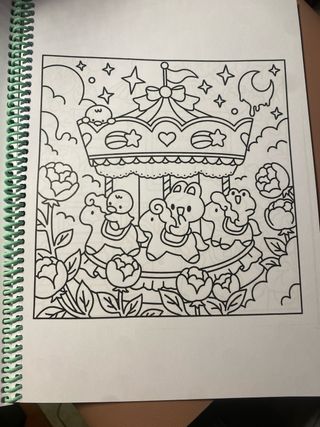 Libro de colorear con temática Dreamy Days y diseño Kawaii. - Portada con carrusel y personajes adorables. - Incluye flores y nubes. - Título Cute Kawaii Coloring Book en la parte inferior.