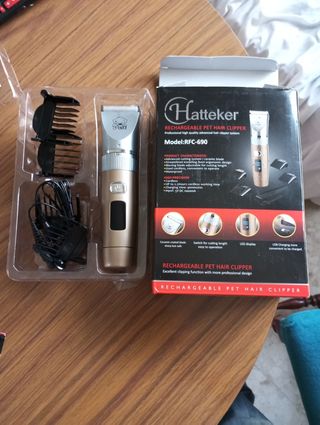 Cortapelos recargable para mascotas de la marca Hattaker, modelo RFC-690. Diseñado para un uso profesional y de alta calidad. - Cuchilla de cerámica avanzada. - Diseño ergonómico y estilizado. - Cuchilla móvil ajustable para diferentes longitudes de corte. - Uso inalámbrico, conveniente para operar. - Resistente al agua. - Precisión alta. - Hasta 2.5 horas de uso inalámbrico. - Tiempo de carga: 90 minutos. - Entrada: 5V DC 1000mA. - Pantalla LED. - Carga USB conveniente.