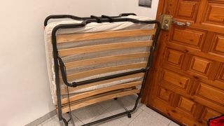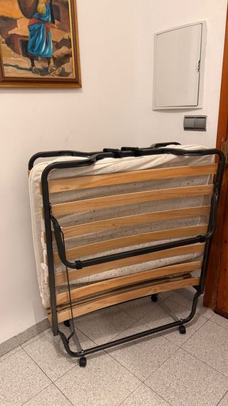 Cama plegable con estructura de metal y base de madera. - Fácil de guardar y transportar. - Ruedas para mayor movilidad. - Muy buen estado, colchón en estado aceptable