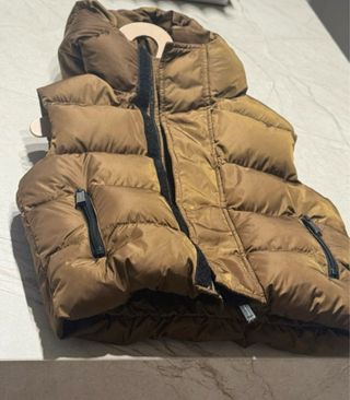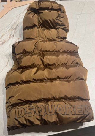 Chaleco acolchado para niño de la marca Dsquared2. Tiene las pegatinas en las cremalleras protegiéndolas - Color marrón. - Diseño con capucha. - Logo de la marca estampado en la parte inferior.