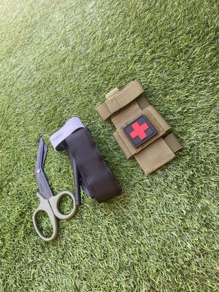 Kit de primeros auxilios que incluye un torniquete táctico negro y unas tijeras de trauma. - Torniquete con sistema de ajuste rápido y varilla para aplicar presión. - Marcaje TIME: en la banda del torniquete. - Tijeras de trauma negras con punta roma para seguridad.