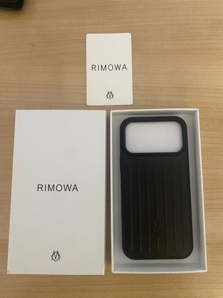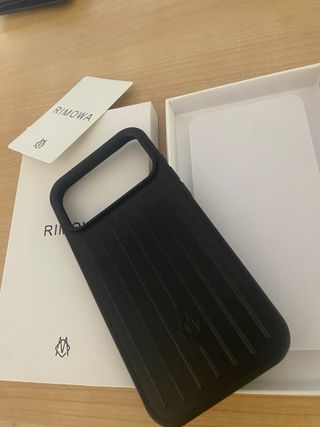 Funda negra de la marca Rimowa para iPhone 17 Pro Max. Diseño elegante y distintivo. - Color negro. - Diseño acanalado característico. - Incluye tarjeta de autenticidad.