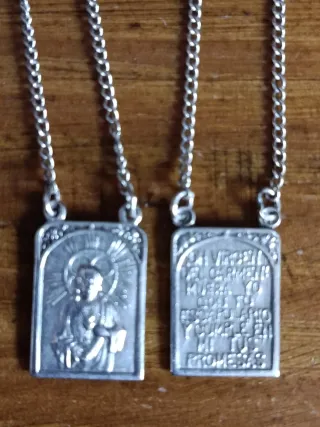 Escapulario de la Virgen del Carmen, una pieza antigua con detalles grabados. - Diseño con la imagen de la Virgen del Carmen en un lado. - Inscripción religiosa en el reverso. - Cadena metálica incluida.