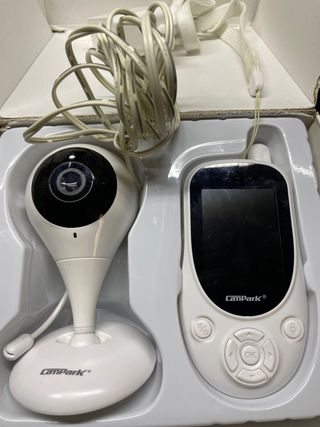 Sistema de vigilancia para bebés con cámara y monitor. - Cámara blanca con base. - Monitor portátil. - Cable de alimentación incluido.