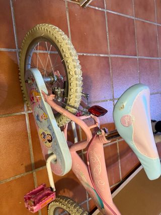 Bicicleta infantil de la marca Disney, ideal para niñas. - Color rosa con detalles. - Manillar con puños blancos y rosas. - Pedales rosas. - Sillín azul y rosa.