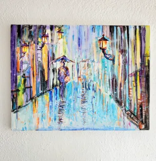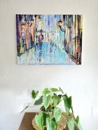 Cuadro decorativo contemporáneo inspirado en el estilo de Leonid Afremov, no original. Escena urbana bajo la lluvia con farolas encendidas y reflejos de colores, de estilo expresivo y moderno. Lienzo montado sobre bastidor de madera, listo para colgar. 📐 Medidas: 61 × 45,5 cm 🎨 Técnica: acrílico sobre lienzo 🖼️ Estado: muy buen estado (marcas leves en la parte trasera) 🔹 Más objetos decorativos en mi perfil