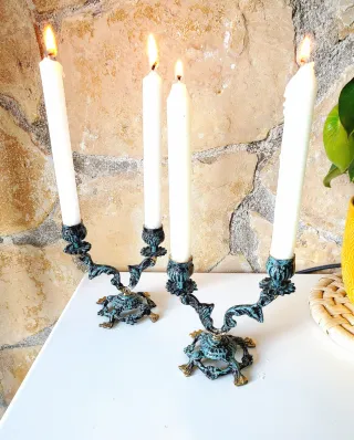 Elegante pareja de candelabros decorativos vintage en metal moldeado con pátina verde gris y detalles dorados. Diseño barroco decorativo con dos brazos sinuosos y base calada de cuatro apoyos. Muy decorativos y estables, ideales para crear un ambiente cálido y elegante. ✨ Detalles Pareja de candelabros de 2 brazos Metal moldeado con pátina verde gris Estilo barroco decorativo Época estimada: siglo XX Para velas finas Muy buen estado (Las velas no están incluidas, solo para ambientación) 📦 Envío cuidado