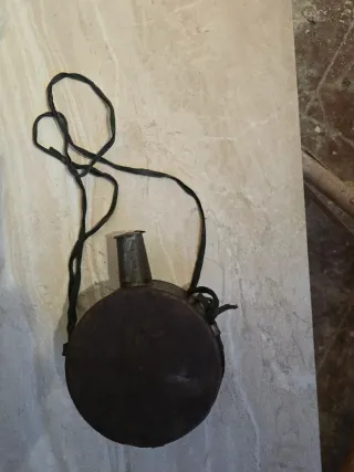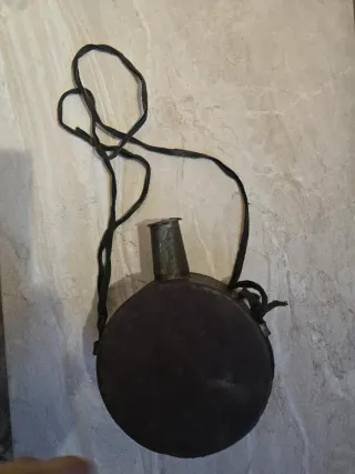 Cantimplora antigua con un diseño circular y un asa de cuerda. - Material: Cuero y metal. - Color: Marrón oscuro y plateado.
