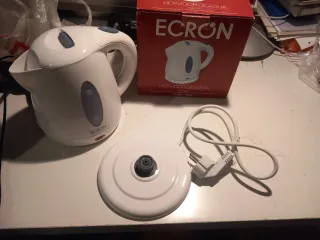 Hervidor de agua de la marca ECRON, ideal para calentar agua rápidamente. Su diseño blanco y compacto lo hace práctico para cualquier cocina. - Capacidad máxima de 1.7L. - Indicador de nivel de agua. - Base giratoria 360º. - Protección contra sobrecalentamiento. -Regalo: Calentador de vaso