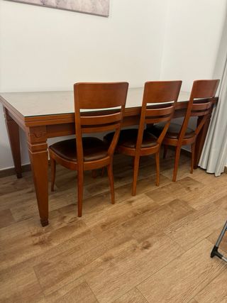 Conjunto de mesa de madera estilo provenzal 1,80 m extensible hasta 2,20 m con tapa de cristal y 6 sillas a juego tapizadas en piel. - Mesa con detalles de madera. - Tapa de cristal. - Seis sillas tapizadas en piel.