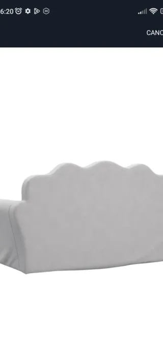 Sofá diseñado para niños, con un acabado suave y cómodo. - Diseño con respaldo ondulado. - Tapicería de tela gris claro.
