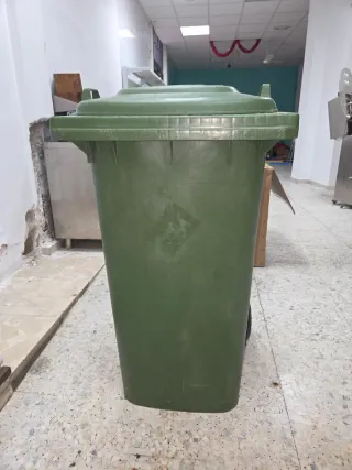 Contenedor de gran capacidad con ruedas para facilitar su transporte. - Capacidad de 240 litros. - Fabricado en plástico resistente. - Diseño con dos ruedas. - Color verde.