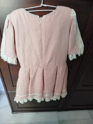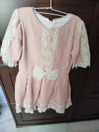 Precioso vestido rosa para niña, con detalles de encaje y un bonito lazo. - Color rosa pálido. - Mangas cortas con encaje. - Adorno de lazo en la parte trasera. - Detalles de encaje en el pecho y bajo. - Tejido con textura. Talla 10 Hecho para una boda puesto una sola vez nuevo como para estrenar