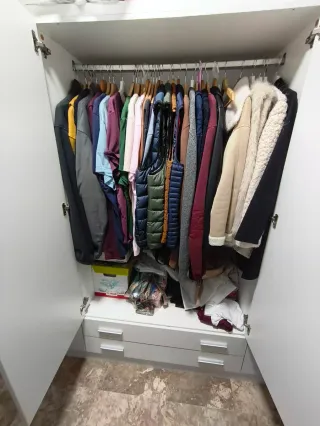Armario de gran capacidad con un diseño moderno y limpio. - Puertas batientes. - Cajones inferiores para almacenamiento adicional. - Tiradores metálicos. - 2 metros ancho, 1,90 de alto y 55 de fondo. - Desmontaje y transporte a cargo del comprador - Antes de desmontar hay que abonar