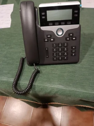 Teléfono de escritorio Cisco en color negro. - Diseño moderno y funcional. - Teclado numérico completo. - Pantalla de visualización. - La caja se tiró y los papeles también