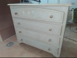 Juego de muebles de dormitorio, estilo clásico , en perfecto estado, madera de calidad y muy buenas condiciones. Ideal para habitación infantiles o de una sola cama. Se compone de : COMODA ( 109*49*94), incluye cristal para la superficial superior de la cómoda, con cuatro cajones amplios. 1 MESITA DE NOCHE, en las mismas condiciones que la comoda de 3 cajones, con cristal y de medidas ( 53*37*67) ESPEJO A juego con el conjunto, de 75*87*3. CEBECERO de cama , igualmente a juego con todo el conjunto del dormitorio. - Tiradores redondos. - Acabado en color beige con toques multicolor.