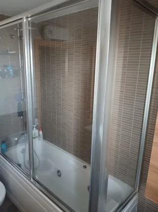 Mampara de ducha con un diseño moderno y elegante con puerta corredera, y lateral fijo, en buenas condiciones, para un perfecto uso habría que cambiarles los rodamientos para la puerta correda. En mi perfil también bañera de hidromasaje para esta mampara o cualquier otra.