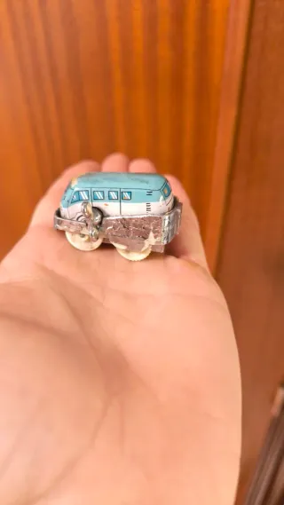 Pequeño coche de juguete con diseño de furgoneta Volkswagen T1. - Color azul y blanco. - Detalles plateados en el parachoques. - Ruedas blancas.
