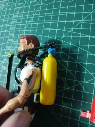 Figura de acción Madelman Hombre Rana de la primera generación. Un clásico para coleccionistas, con accesorios, bombonas y equipo respiración, linterna, fusil sin arpón, cinturón de pesas y remo. Le falta una aleta y algún dedo.