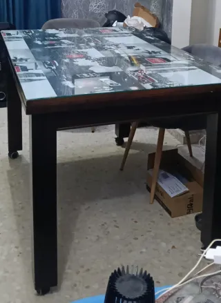 Mesa de roble rectangular de alta calidad y diseño, elaborada por un carpintero a medida de color marrón, extensible ( casi nunca se ha abierto), patas robustas cuadradas con ruedas para un mejor desplazamiento que se pueden quitar. Se entrega con un cristal a medida y un mantel plastificado. Urge por traslado.