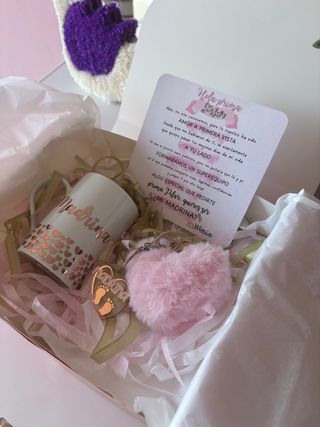 Preciosa caja personalizada con un mensaje especial para pedirle a alguien que sea tu madrina. Contiene una taza con corazones dorados y un llavero de peluche rosa con forma de corazón y una chapa con huellas de bebé. - Taza con diseño de corazones. - Llavero de peluche rosa. - Llavero con huellas de bebé y texto Madrina. - Tarjeta con mensaje personalizado.