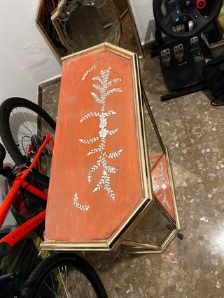 Mueble de entrada con un diseño hexagonal y detalles dorados. - Estructura metálica con acabado dorado. - Paneles de cristal. - Base con diseño decorativo.