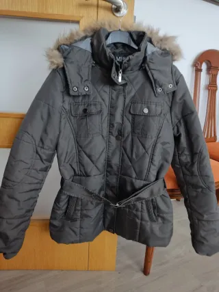 Chaqueta de plumón con un diseño acolchado y detalles modernos. - Capucha con ribete de pelo sintético. - Cinturón para ajustar la cintura. - Bolsillos frontales con solapa. - Cierre de cremallera y botones. Está bien cuidado.