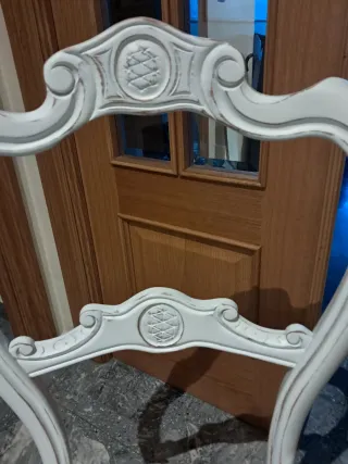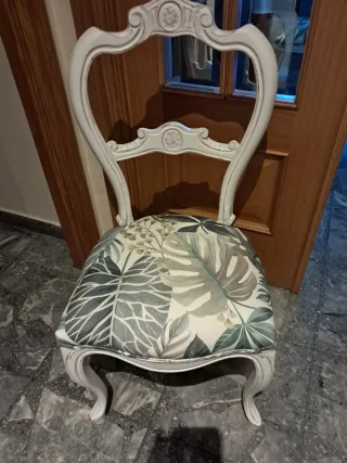 Elegante silla de estilo Isabelino con un diseño inspirado en el estilo francés. Su tapizado floral aporta un toque de color y frescura. - Patas curvas de madera. - Respaldo ornamentado. - Tapizada y lacada profesional y después no se a usado, tengo 4