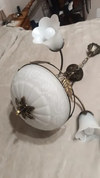Conjunto de lámpara de techo con un diseño elegante y dos lamparitas a juego. - Lámpara de techo con pantalla de cristal blanco texturizado. - Dos apliques de pared o mesita de noche con tulipas de cristal blanco. - Detalles ornamentales en acabado dorado. Las lamparitas no tienen tulipas pero están como nuevas