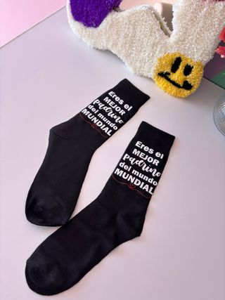 Un par de calcetines negros con un mensaje especial para el mejor padrino. - Diseño con texto Eres el MEJOR padrino del mundo MUNDIAL. - Detalle de corazón rojo. - Talla única.