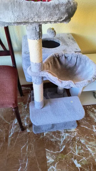 Rascador para gatos con varios niveles y juguetes. - Plataforma superior con borde acolchado. - Cama tipo hamaca. - Plataforma de descanso. - Casa o escondite para el gato. - Juguetes colgantes.