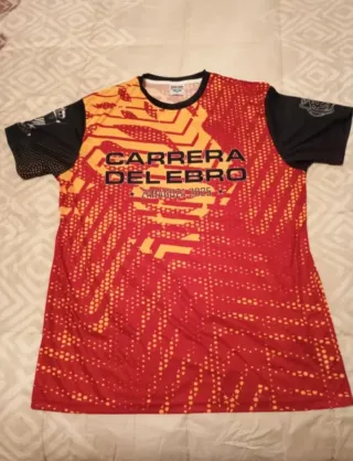 Camiseta de la Carrera del Ebro, Brigada Aragón I. Diseño deportivo en rojo y amarillo. - Mangas negras con detalles. - Estampado frontal con el nombre de la carrera y ZARAGOZA 2025.