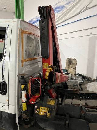 Grúa hidráulica Fassi F45. Esta montada en una iveco daily - Modelo F45. - Color rojo y negro. - Componentes hidráulicos visibles