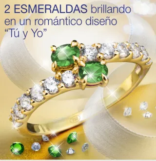 Elegante anillo de oro de 18 quilates con un diseño único. - Dos esmeraldas centrales. - Acompañado de pequeños topacios blancos. - Acabado brillante en oro amarillo.