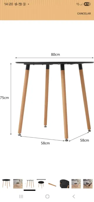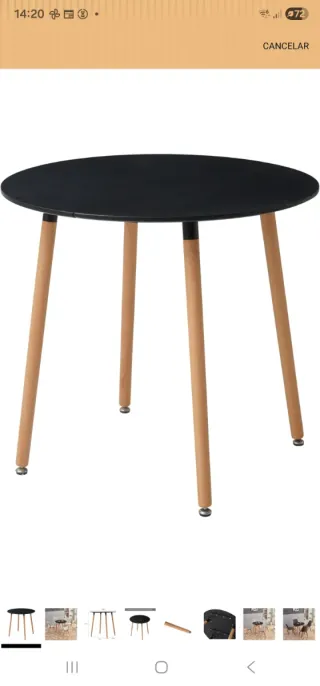 Elegante mesa redonda con un diseño moderno y minimalista. Perfecta para dar un toque de estilo a tu hogar. - Tablero de color negro. - Patas de madera en tono natural. 4 mesas