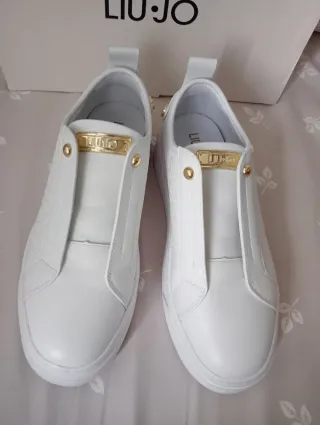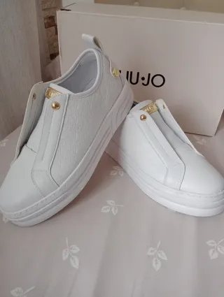 Zapatillas de la marca Liu Jo en color blanco. Presentan un diseño moderno y elegante. - Detalle de logo grabado en relieve. - Adorno metálico dorado en la lengüeta. - Cierre sin cordones. - Suela de plataforma.